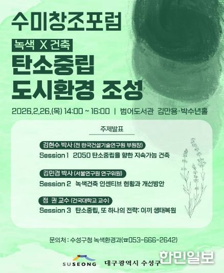한민일보 서울포커스 진광성 기자 | 대구 수성구는 이달 26일 ‘녹색×건축: 탄소중립 도시환경 조성’을 주제로 범어도서관 김만용·박수년홀에서 ‘수미창조 포럼’을 개최한다고 밝혔다.