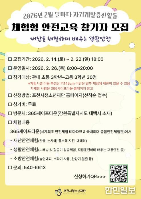 한민일보 서울포커스 심기옥 기자 | 포천시청소년재단은 오는 22일까지 체험형 안전 활동을 주제로 한 ‘달마다 자기계발 증진활동’ 2월 프로그램 참가자를 모집한다.