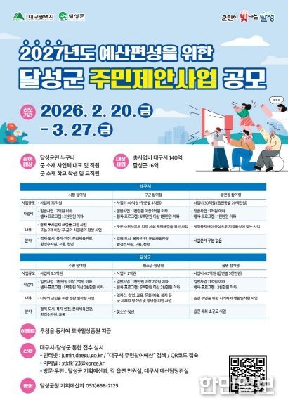 한민일보 서울포커스 임경복 기자 | 대구 달성군은 2026년 주민제안사업을 2월 20일부터 3월 27일까지 공모한다고 밝혔다.