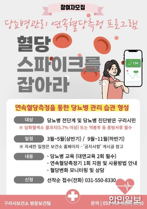 한민일보 서울포커스 임경복 기자 | 구리시 보건소는 2월 23일부터 당뇨병관리 연속혈당측정 프로그램 '혈당 스파이크를 잡아라'의 참여자를 모집한다고 밝혔다.