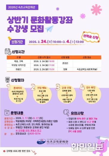 한민일보 서울포커스 곽중희 기자 | 속초교육문화관은 3월부터 6월까지 지역 주민의 다양한 학습 수용에 부응하고 배움과 자기계발의 기회를 제공하기 위해 ‘2026년 상반기 문화활동강좌’를 운영한다.