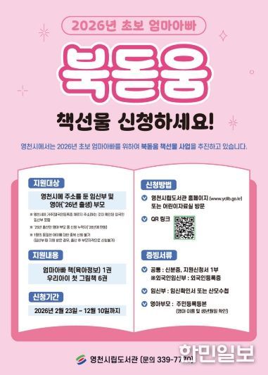 한민일보 서울포커스 김봉순 기자 | 영천시 평생학습관(관장 정경자)은 초보 부모의 육아 부담을 덜고, 영아기 독서환경 조성을 위해 ‘2026년 초보 엄마아빠 북돋움 책선물 사업’을 2월 23일부터 12월까지 운영한다.