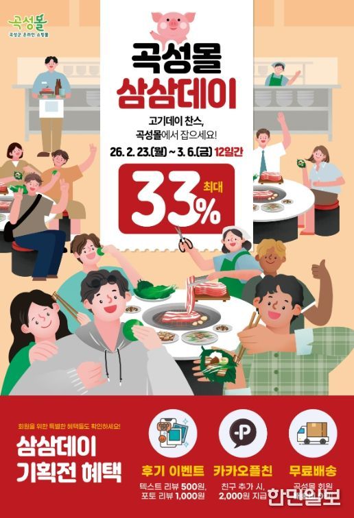 한민일보 서울포커스 박용남 기자 | 전남 곡성군은 3월 3일 삼겹살데이를 맞아 곡성군 공식 온라인 쇼핑몰 ‘곡성몰’에서 ‘삼삼데이 특별전’을 운영한다고 23일 밝혔다.