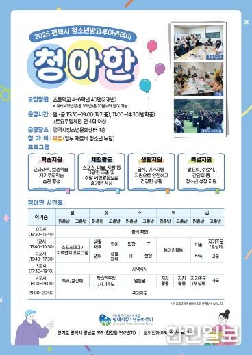 청아한 관계자는 “청아한은 배움과 체험, 돌봄이 조화를 이루는 프로그램으로 청소년들이 안전한 환경에서 다양한 경험을 할 수 있도록 지원하고 있다”라며 “2026년을 함께할 청소년들의 많은 관심과 참여를 바란다”라고 말했다.