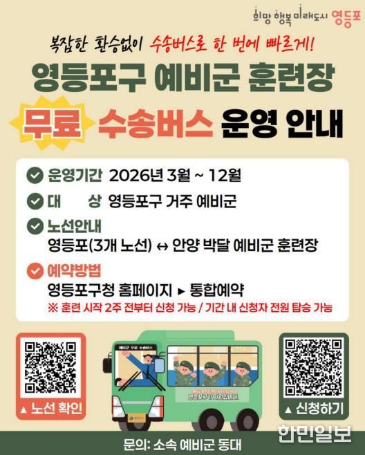 한민일보 서울포커스 임경복 기자 | 영등포구가 3월부터 12월까지 안양 박달과학화훈련장에서 훈련받는 관내 예비군을 대상으로 무료 수송버스를 운영하며, 지난해에 이어 올해도 신청자 전원이 이용할 수 있도록 지원한다고 밝혔다.