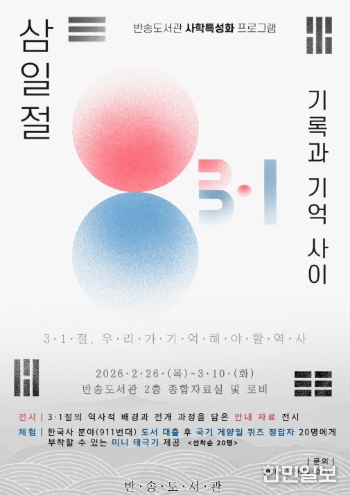 한민일보 서울포커스 임광현 기자 | 부산시교육청 부산광역시립반송도서관은 26일부터 3월 10일까지 반송도서관에서 시민들을 대상으로 사학 특성화 프로그램 ‘3·1절, 기록과 기억 사이’를 운영한다.