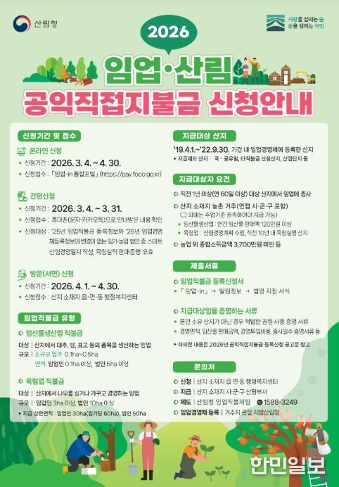 한민일보 서울포커스 진광성 기자 | 북부지방산림청은 '2026년 임업·산림 공익직접지불금' 신청을 3월 4일부터 4월 30일까지 접수한다고 밝혔다.