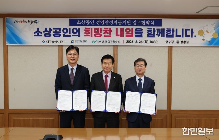 한민일보 서울포커스 임경복 기자 | 대구 중구는 지난 24일 구청 상황실에서 대구신용보증재단, iM뱅크 중구청지점과 업무협약을 체결하고 고금리 장기화와 내수 회복 지연으로 어려움을 겪는 소상공인의 자금난 해소와 이자 부담 완화를 위해 총 30억 원 규모의 ‘2026년 소상공인 경영안정자금’을 지원한다.