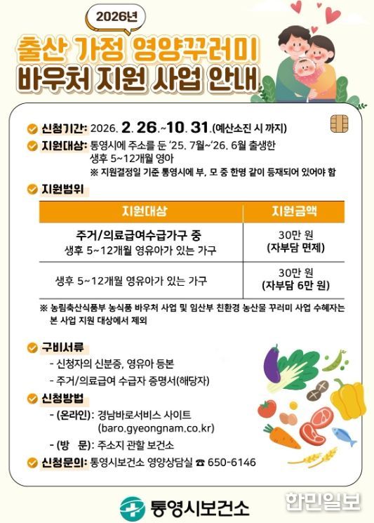 한민일보 서울포커스 김서윤 기자 | 통영시는 영아의 건강한 성장·발달 도모 및 출산 가정의 경제적 부담을 완화하기 위해 2026년 신규사업으로 '출산 가정 영양꾸러미 바우처 지원사업'을 시행한다고 24일 밝혔다.