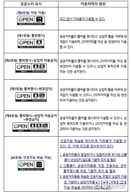 아울러, 기존 공공누리 유형(제1~4유형)의 이용조건은 유지하면서 인공지능(AI) 학습 목적으로는 공공저작물을 자유롭게 활용할 수 있는 ‘인공지능(AI)유형’도 새롭게 마련했다. 기존에 상업적 이용이나 변경 이용이 허용되지 않는 공공저작물이라도 ‘인공지능(AI)유형’을 기존 공공누리 유형과 함께 표시할 경우, 인공지능(AI) 학습에는 자유롭게 활용할 수 있다는 점에서 인공지능(AI) 분야의 활성화를 위해 개방할 수 있는 공공저작물의 범위가 크게 확대될 전망이다.