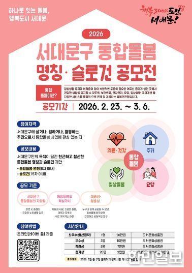 한민일보 서울포커스 김서윤 기자 | 서대문구가 3월 27일 통합돌봄 제도 시행을 앞두고 서대문구만의 브랜드 정체성을 구축하기 위해 사업 명칭과 슬로건을 공모한다.
