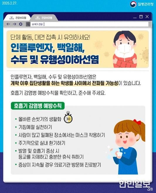 개학 초기에는 교실 내 밀접 접촉과 공동생활 시간이 늘어 수두, 유행성이하선염, 홍역, 유행성 감기 등 호흡기 감염병이 집단 발생하기 쉽다. 특히 학령기 아동·청소년은 감염에 취약하고 전파 속도 또한 빨라 철저한 예방과 관리가 필요하다.