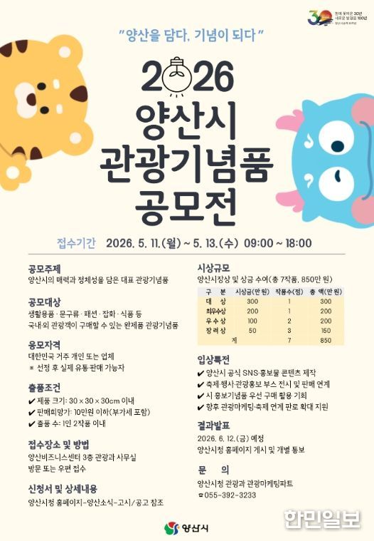 또 시는 올해 처음으로 '2026년 양산시 관광기념품 공모전'을 개최해 관광캐릭터를 포함한 지역 특화 소재를 활용한 창의적 관광상품 발굴에 나서고 있다.