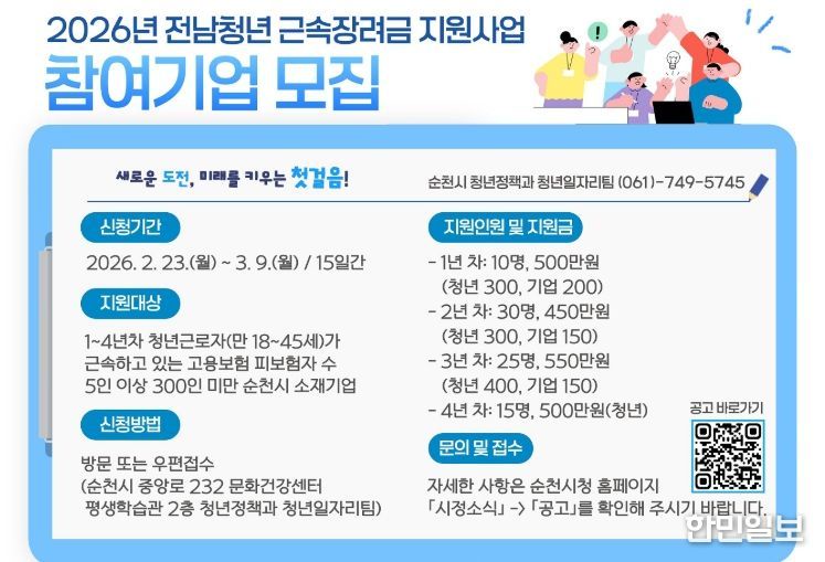 한민일보 서울포커스 임광현 기자 | 순천시는 지역 청년들의 정규직 취업 촉진 및 장기근속을 유도하기 위해 2026년 전남 청년 근속장려금 지원사업 참여 기업을 모집한다고 밝혔다.
