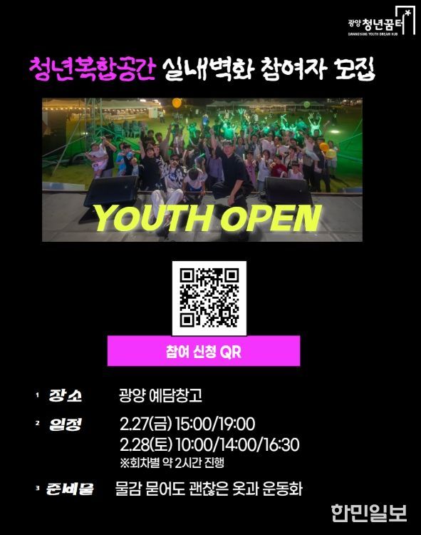 한편, 청년복합공간 실내벽화 프로젝트 참여자 모집과 관련된 자세한 사항은 광양청년꿈터 누리집 또는 전화 문의를 통해 확인할 수 있다.