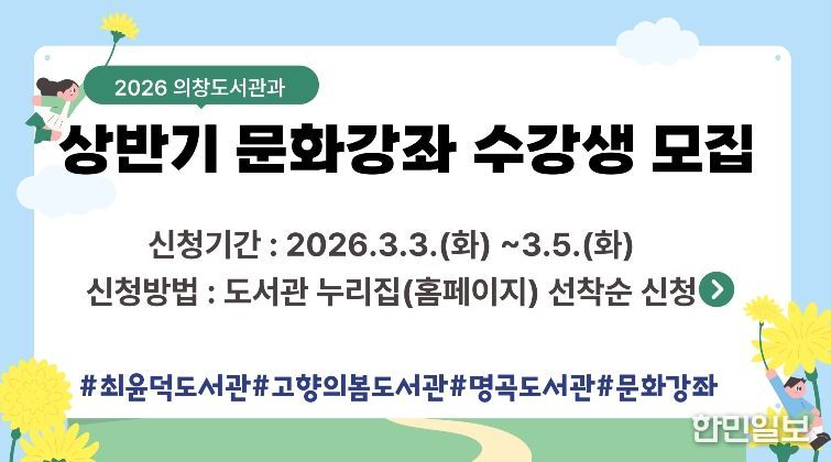 한민일보 서울포커스 김서윤 기자 | 창원특례시 의창도서관과(과장 김외화)는 다양한 문화강좌를 통해 시민의 평생교육을 지원하고 문화생활의 기회를 제공하기 위해 ‘2026년 의창도서관과 상반기 문화강좌’ 수강생을 모집한다.