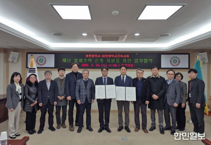 한민일보 서울포커스 김서윤 기자 | 대전시는 25일 시청 중회의실에서 대전광역시건축사회와 ‘재난 피해주택 신축 지원을 위한 업무협약’을 체결했다.