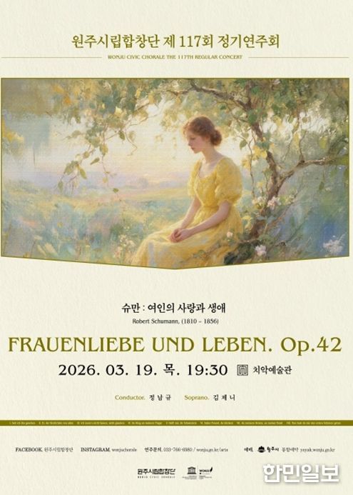 한민일보 서울포커스 임경복 기자 | 원주시립합창단은 다음 달 19일 오후 7시 30분 치악예술관에서 제117회 정기연주회 ‘여인의 사랑과 생애’를 개최한다.