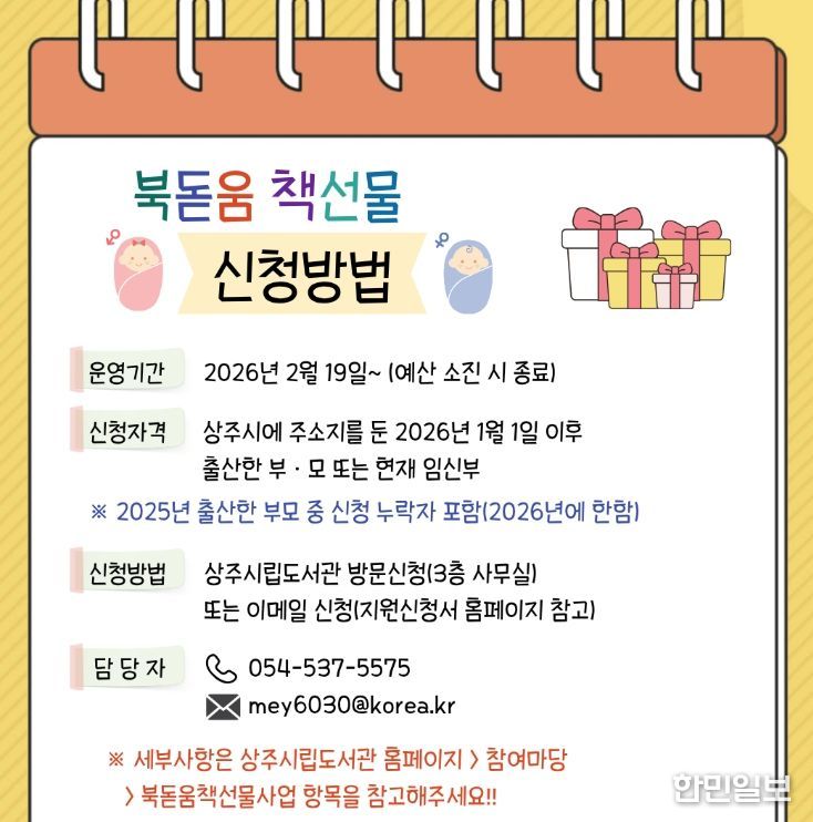 한민일보 서울포커스 김봉순 기자 | 상주시립도서관이 경북도와 함께 '2026년 초보 엄마·아빠 북돋움 책선물 사업'을 시행한다.