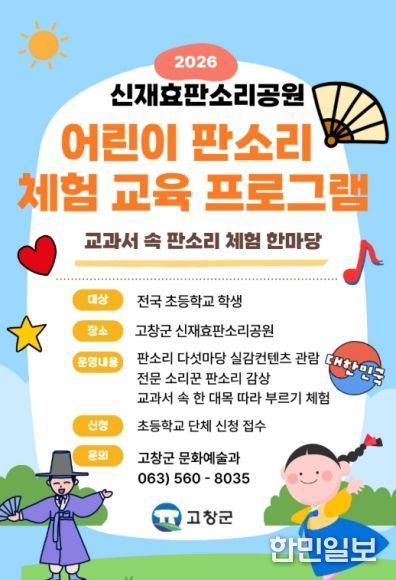 한민일보 서울포커스 박용남 기자 | 고창군 신재효판소리공원이 전국 초등학생을 대상으로 ‘판소리 다섯마당 실감컨텐츠 연계 체험 교육 프로그램’을 운영한다고 26일 밝혔다.