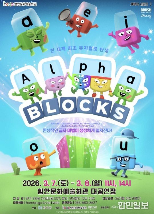 한민일보 서울포커스 김서윤 기자 | 함안군은 오는 3월 7일부터 8일까지 이틀간 오전 11시와 오후 2시, 모두 4회에 걸쳐 가족뮤지컬 '알파블록스'를 함안문화예술회관 대공연장에서 공연한다고 26일 밝혔다.