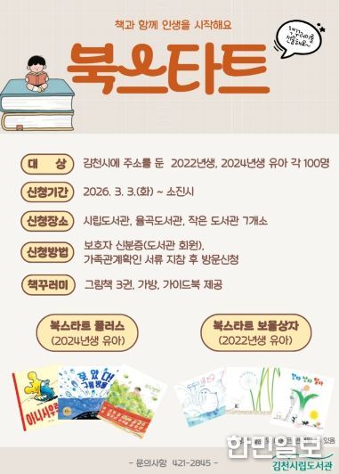 한민일보 서울포커스 임경복 기자 | 김천시립도서관(관장 이신기)은 오는 3월 3일부터 관내에 주소를 둔 유아들에게 생애 처음 책꾸러미를 선물하는 '북스타트'를 운영한다.