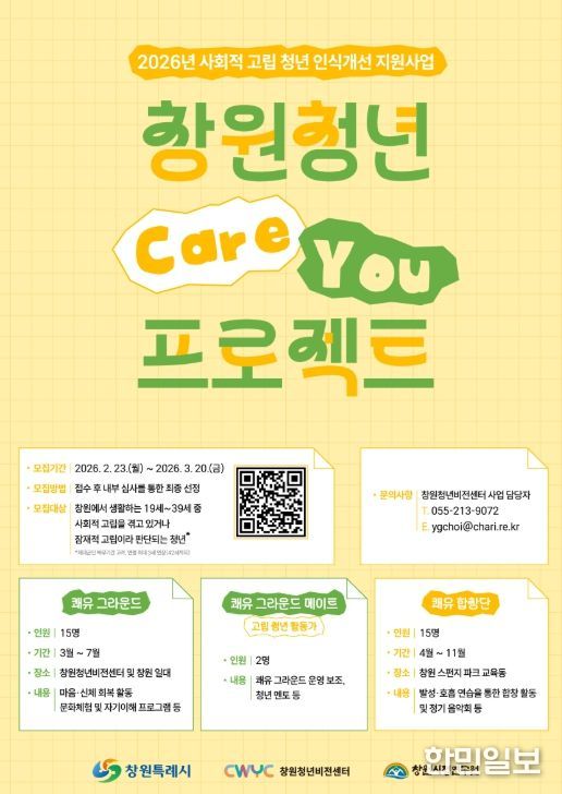 한민일보 서울포커스 김서윤 기자 | 창원특례시 창원청년비전센터는 사회적 고립 청년의 건강한 사회 복귀를 돕기 위해 ‘2026년 창원 청년 쾌유(Care-you) 프로젝트’ 참여자를 2월 23일부터 3월 20일까지 모집한다.
