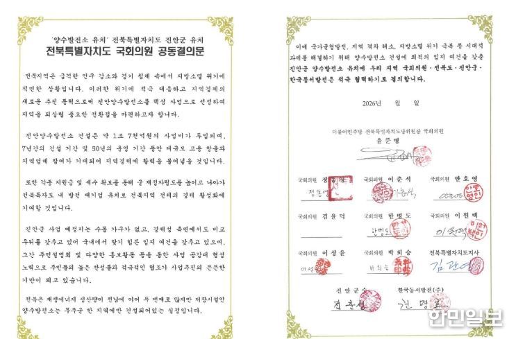 진안군 관계자는 “양수발전소 유치는 진안군을 넘어 전북 전체의 미래 경쟁력과 직결된 과제”라며 “전북특별자치도와 지역 국회의원들이 함께 뜻을 모아 공동서명으로 이어졌다는 것은 전북이 하나의 팀으로 움직이고 있다는 상징적인 의미를 갖는다”고 밝혔다.