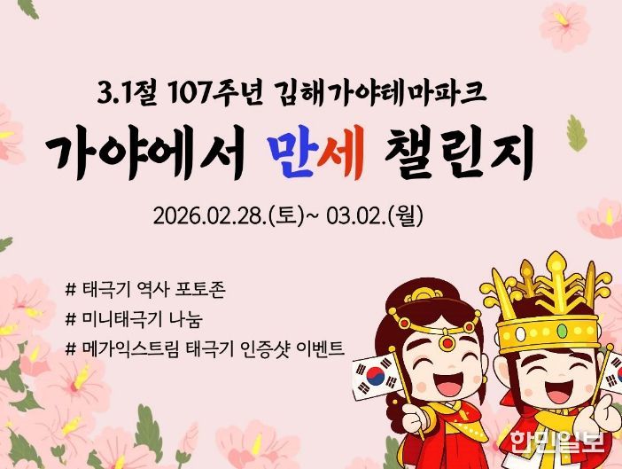 한민일보 서울포커스 김은금 기자 | (재)김해문화관광재단 김해가야테마파크가 3·1절 107주년을 맞아 방문객과 함께하는 ‘가야에서 만세 챌린지’를 오는 2월 28일부터 3월 2일까지 3일간 진행한다.