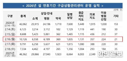한민일보 서울포커스 최성훈 기자 | 소방청은 2026년 설 연휴 기간(2.14.~2.18., 5일간)전국 총 45,082건의 구급 출동으로 24,166명을 이송하였으며, 구급상황관리센터에서 총 42,062건의 상담을 실시했다고 밝혔다.