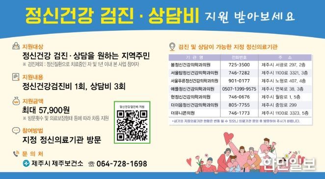 지원 대상은 최근 1년 이내 정신건강의학과 진료 이력이 없는 제주시민으로 지정 정신의료기관을 방문하면 1인당 연 3회, 최대 5만 7,900원 한도 내에서 ‘정신건강검진비 및 상담비’를 지원받을 수 있다.