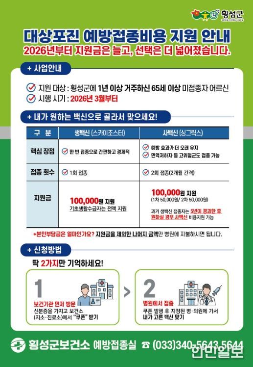 한민일보 서울포커스 진광성 기자 | 횡성군이 고령층의 극심한 통증과 후유증을 유발하는 대상포진을 예방하기 위해 오는 3월부터 ‘2026년 대상포진 예방접종 비용 지원사업’을 확대 시행한다.