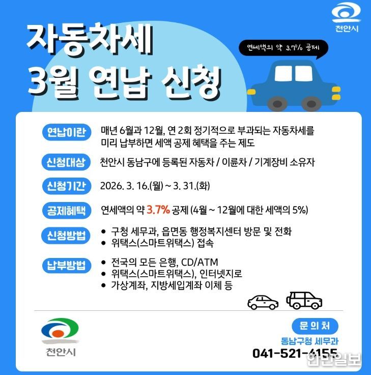 한민일보 서울포커스 황준형 기자 | 천안시 동남구는 내달 16~ 31일 자동차세 연납 신청을 받는다고 27일 밝혔다.