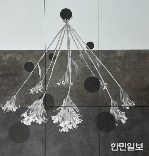 이번 전시에서 조 작가는 종이에 먹으로 작업한 한국화 작품 20여 점을 선보인다. 뿌리가 잘려 나간 절화와 검은 원을 한 공간에 배치해 형태가 있는 것과 없는 것이 공존하는 세계를 표현했다.