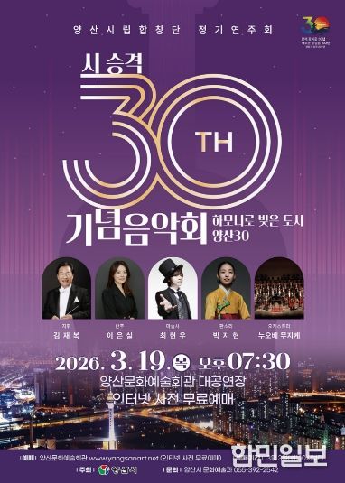 한민일보 서울포커스 김은금 기자 | 양산시는 오는 2026년 3월 19일 목요일 저녁 7시 30분부터 90분간 양산문화예술회관 대공연장에서 시 승격 30주년을 기념하는 양산시립합창단 정기연주회 ‘하모니로 빚은 도시 양산30’을 개최한다.