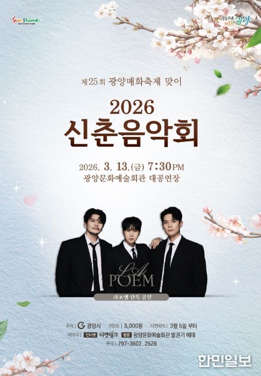 한민일보 서울포커스 임광현 기자 | 광양시는 오는 3월 13일 오후 7시 30분 광양문화예술회관 대공연장에서 제25회 광양매화축제의 시작을 알리는 '2026 신춘음악회'를 개최한다.