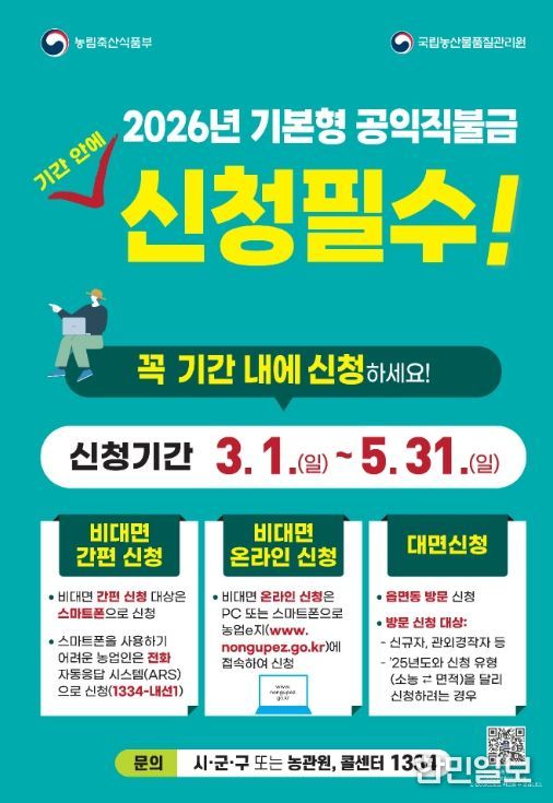 한민일보 서울포커스 임광현 기자 | 광양시는 농업·농촌의 공익기능을 증진하고 농업인의 소득 안정을 도모하기 위해 3월 1일부터 5월 31일까지 ‘2026년 기본형 공익직불제’ 접수를 실시한다.