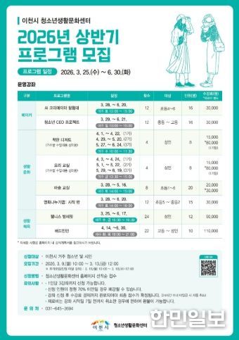 한민일보 서울포커스 박용남 기자 | 이천시 청소년생활문화센터가 청소년과 지역주민의 건강한 생활문화 형성과 역량 강화를 위해 ‘2026년 상반기 프로그램’을 운영하고 수강생을 모집한다고 밝혔다.