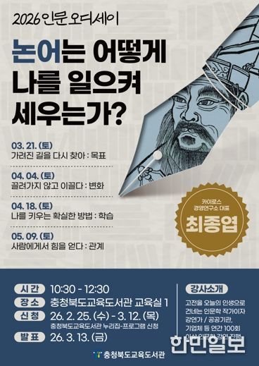 한민일보 서울포커스 임경복 기자 | 충청북도교육청 직속기관 교육도서관은 오는 3월 21일부터 5월 9일까지 격주 토요일 운영하는 〈2026 인문 오디세이: 논어〉 강연에 참여할 수강생을 모집한다고 밝혔다.