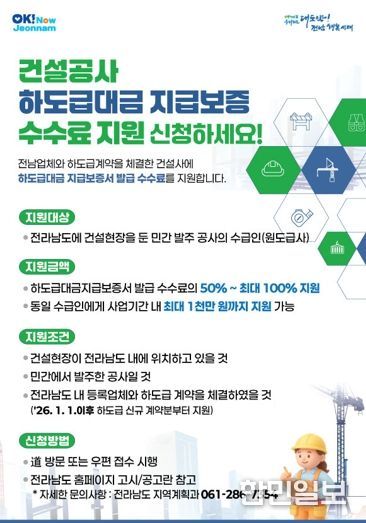 한민일보 서울포커스 박정민 기자 | 전라남도가 건설산업 활력을 높이고 하도급 업체 보호를 위해 ‘2026년 건설공사 하도급대금 지급보증 수수료 지원사업’을 확대 추진한다.