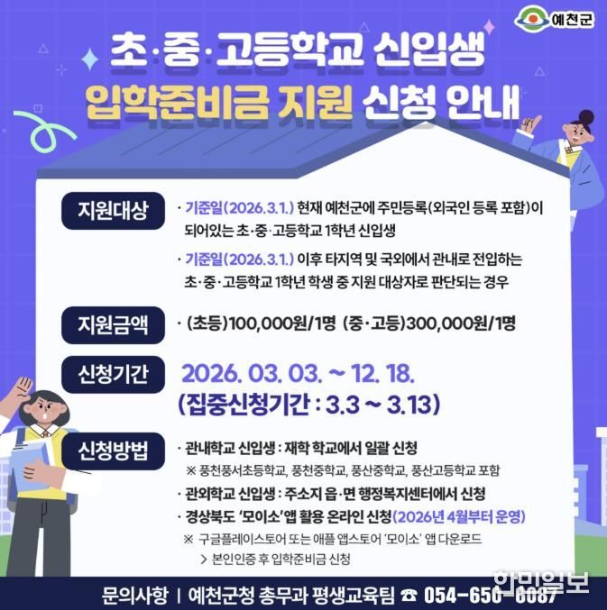 한민일보 서울포커스 임경복 기자 | 예천군은 3일부터 2026학년도 초·중·고등학교 신입생을 대상으로 입학준비금을 지원한다고 밝혔다.