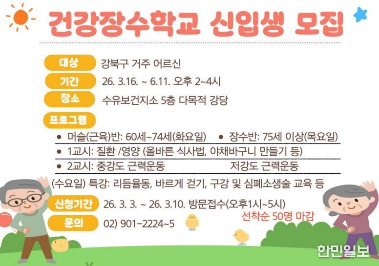 한민일보 서울포커스 김봉순 기자 | 서울 강북구는 어르신들의 활기찬 노후 생활을 지원하고 만성질환 예방을 돕기 위해 오는 16일부터 ‘건강장수학교’를 운영한다고 밝혔다.