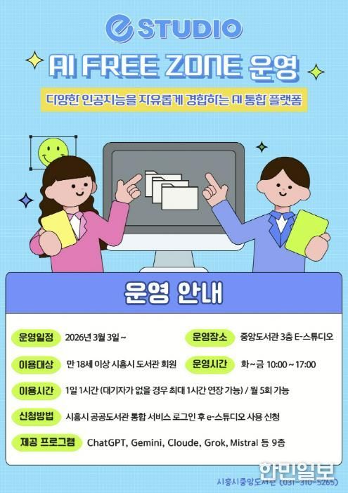 한민일보 서울포커스 유현민 기자 | 시흥시중앙도서관은 시민들의 인공지능(AI) 활용 역량 강화를 위해 시 정보통신과와 협업해 도서관 3층 e-스튜디오에 ‘인공지능(AI) 프리 존(Free Zone)’을 구축하고, 오는 3월 3일부터 본격 운영에 들어간다.