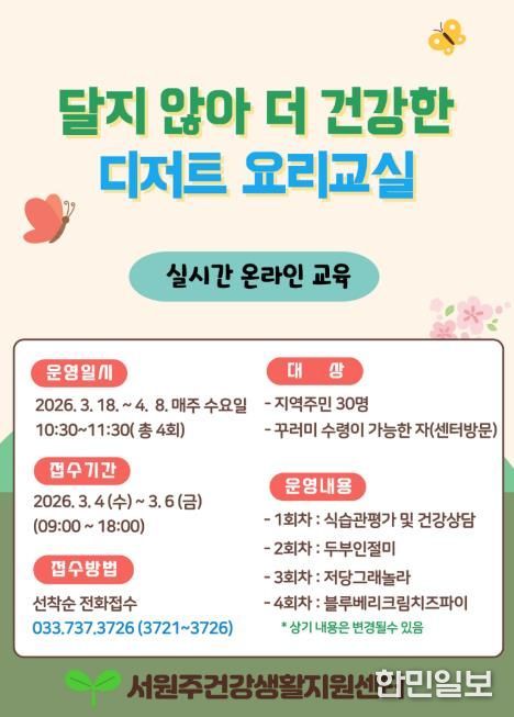 한민일보 서울포커스 임경복 기자 | 서원주건강생활지원센터는 고당류 섭취에 따른 건강 위험을 알리고, 일상에서 실천할 수 있는 건강 조리법을 보급하기 위해 ‘달지 않아 더 건강한 디저트 요리교실’ 프로그램 참여자를 모집한다.