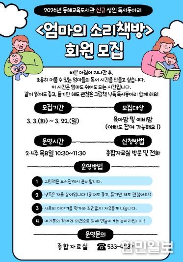 한민일보 서울포커스 임경복 기자 | 동해교육도서관은 3월 3일부터 3월 22일까지 육아로 바쁜 일상에서도 자신만의 시간을 찾고 싶은 엄마들을 위한 그림책 낭독 독서동아리 ‘엄마의 소리책방’ 회원을 모집한다.