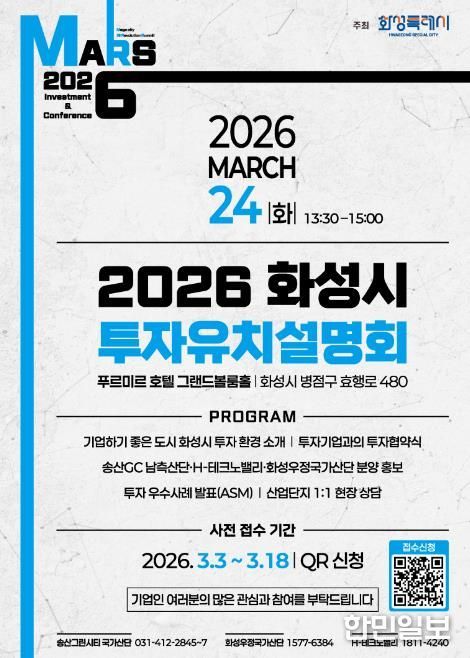 한민일보 서울포커스 진광성 기자 | 화성특례시가 오는 3월 24일 푸르미르 호텔에서 ‘2026 화성특례시 투자유치 설명회’를 개최하고, 3월 3일부터 3월 18일까지 QR코드를 통한 사전접수를 진행한다.