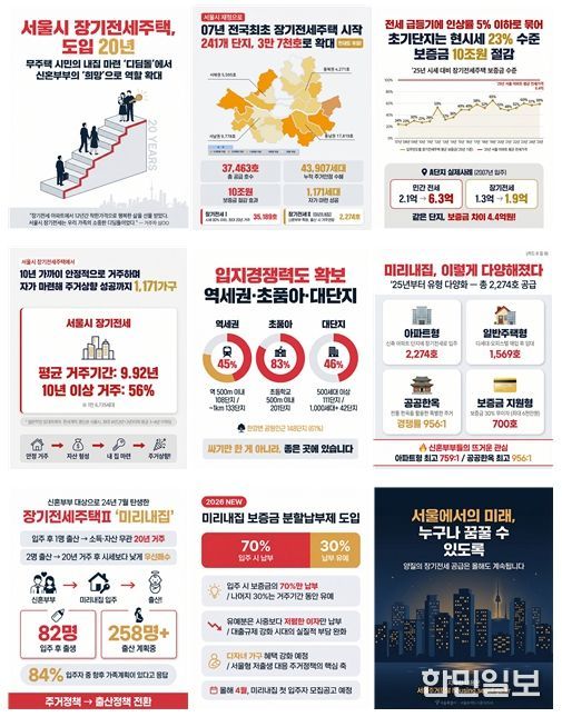 ‘장기전세주택’은 무주택 시민에게 장기간 안정적인 거주 환경을 제공하며 2007년부터 현재까지 241개 단지, 총 37,463호를 공급해 왔다. 지난 2024년에는 신혼부부에 특화된 ‘미리내집(장기전세주택Ⅱ)’을 새롭게 도입해 저출생 대응 주거정책으로 기능을 확대하고 있다. 현재 거주 중인 세대를 포함해 지금까지 총 43,907가구에 안정적인 주거를 제공했다.
