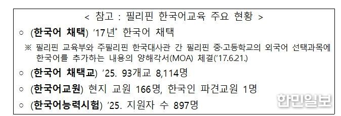필리핀은 2017년에 현지 정규 교육과정의 외국어 과목으로 한국어를 정식 채택하는 것으로 결정하고, 2018년부터 한국어반을 운영해 왔다. 현재는 90여 개 학교에서 8,000여 명의 학생들이 한국어를 배우고 있다. 이번 양해각서는 한국 교육부가 필리핀 내 한국어 교사들을 위한 집중 연수 과정을 지원하여, 한국어교육 전문성을 높이도록 하는 내용이 핵심이다.