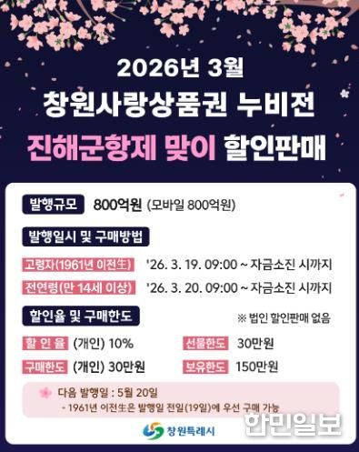 한민일보 서울포커스 김서윤 기자 | 창원특례시는 봄맞이 대표 축제인 진해군항제를 앞두고 관광객 소비를 지역 상권으로 연결하기 위해 800억 원 규모의 ‘모바일 창원사랑상품권(누비전)’을 발행한다고 4일 밝혔다.