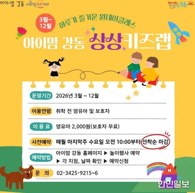 한민일보 서울포커스 박정민 기자 | 서울 강동구는 아이맘 강동에서 미취학 아동을 대상으로 하는 체험형 예체능 일일강좌 ‘상상 키즈랩’을 2026년 3월부터 12월까지 운영한다고 5일 밝혔다.